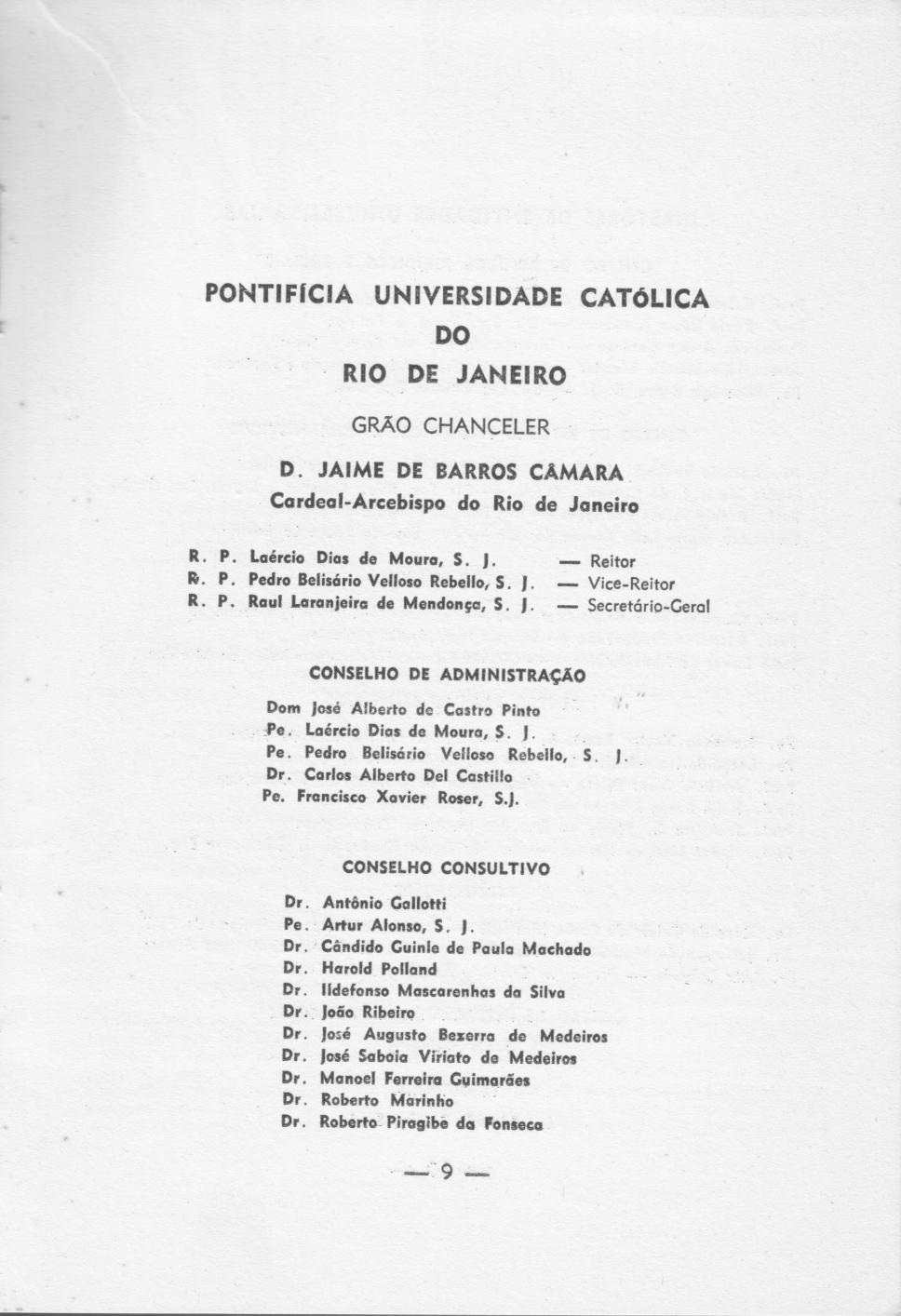 Página 09 do Catálogo Escolar do Centro Técnico Científico. Lista com nomes da administração da Universidade e dos membros dos conselhos de Administração e Consultivo.