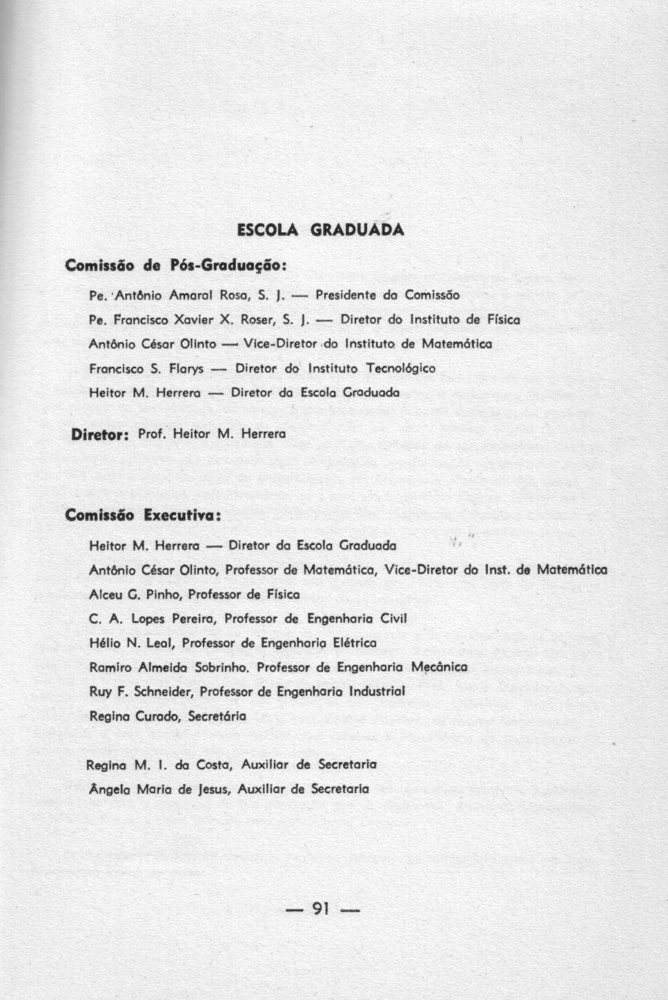 Página 91 do Catálogo Escolar do Centro Técnico Científico. Lista com os membros da Comissão de Pós-Graduação e da Comissão Executiva da Escola Graduada de Ciências e Engenharia (EGCE).