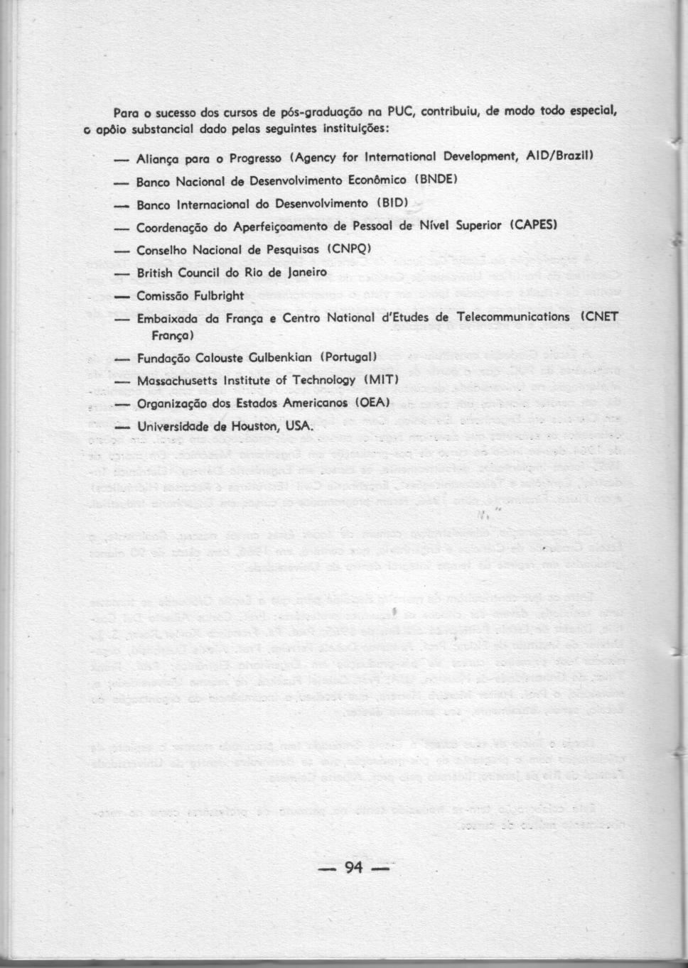 Página 94 do Catálogo Escolar do Centro Técnico Científico. Lista das instituições que contribuíram para o sucesso dos cursos de pós-graduação da PUC-Rio: Aliança para o Progresso (AID/Brazil), BNDE, BID, CAPES, CNPq, British Council, Comissão Fulbright, CNET/França, Fundação Calouste Gulbenkian, MIT, OEA e Univ. de Houston.