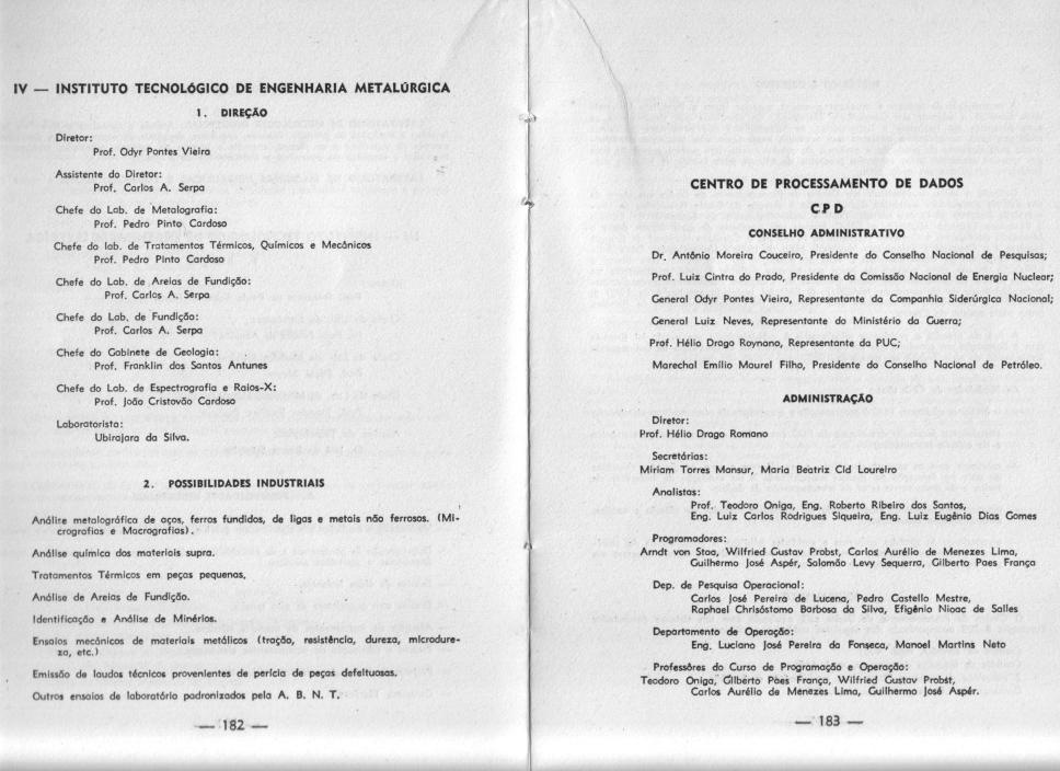 Páginas 182 e 183 do Catálogo Escolar do Centro Técnico Científico. Instituto Tecnológico de Engenharia Metalúrgica e Centro de Processamento de Dados.