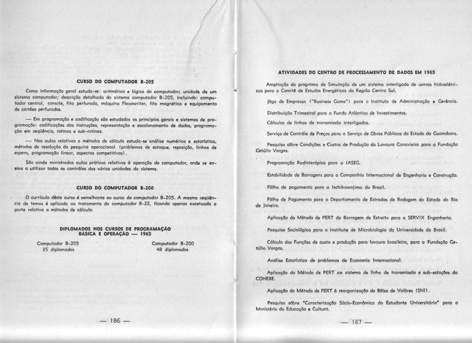 Páginas 186 e 187 do Catálogo Escolar do Centro Técnico Científico. Curso do computador B-205, Curso do computador B-200, Diplomados nos cursos de Programação Básica e Operação - 1965, Atividades do Centro de Processamento de Datos - 1965.