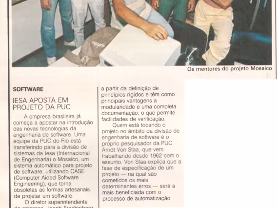 Matéria sobre transferência para a IESA (Internacional Engenharia) do sistema CASE (Computer Aided Software Engineering) desenvolvido pelo Departamento de Informática (INF)da PUC sob coordenação do prof. Arndt von Staa.