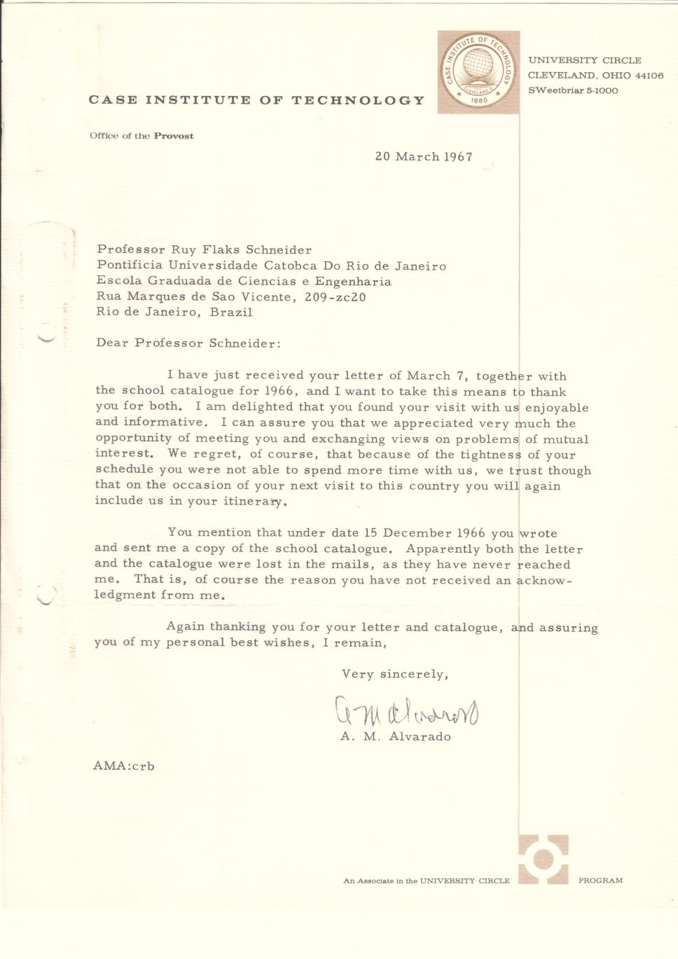 Correspondência de A. M. Alvarado (Case Institute of Technology) para o prof. Ruy Schneider (EGCE). Sobre o envio do catálogo da EGCE de 1966.