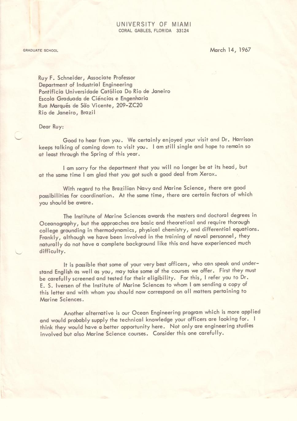 Correspondência de Leonard J. Greenfield (University of Miami) para o prof. Ruy Schneider (IND). Sobre a possibilidade de intercâmbio em Oceanografia, Ciências Marinhas e Navegação.