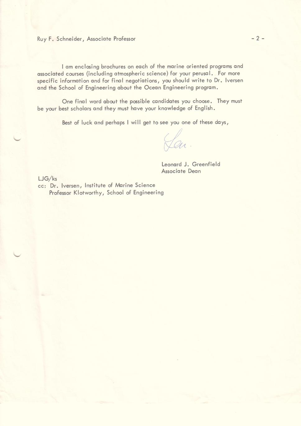 Correspondência de Leonard J. Greenfield (University of Miami) para o prof. Ruy Scneider (IND). Encaminha material sobre programas de pós-graduação em ciências marinhas e atmosféricas.