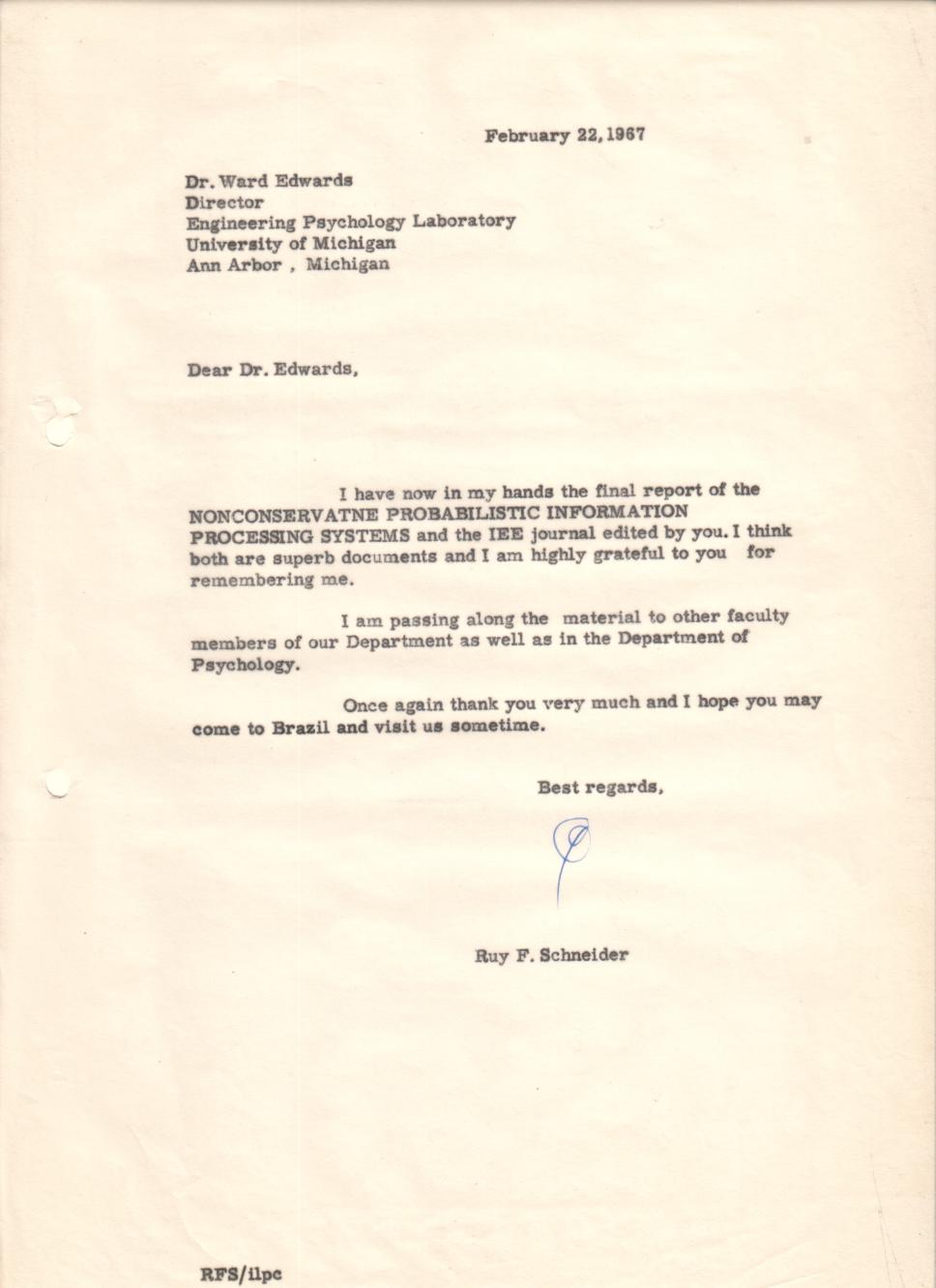 Correspondência do prof. Ruy Schneider (IND) para Ward Edwards (University of Michigan).