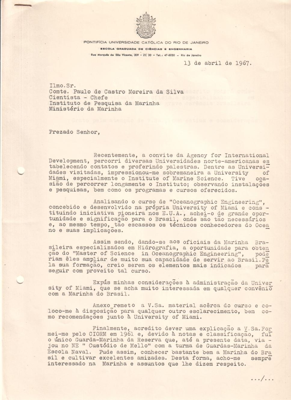 Correspondência do prof. Ruy Schneider (IND) ao comandante Paulo de Castro Moreira da Silva (Instituto de Pesquisa da Marinha). Sobre a possibilidade da criação de um curso de especialização ou pós-graduação em engenharia oceanográfica.