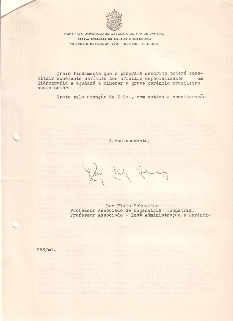 Correspondência do prof. Ruy Schneider (IND) ao comandante Paulo de Castro Moreira da Silva (Instituto de Pesquisa da Marinha). Sobre a possibilidade da criação de um curso de especialização ou pós-graduação em engenharia oceanográfica.
