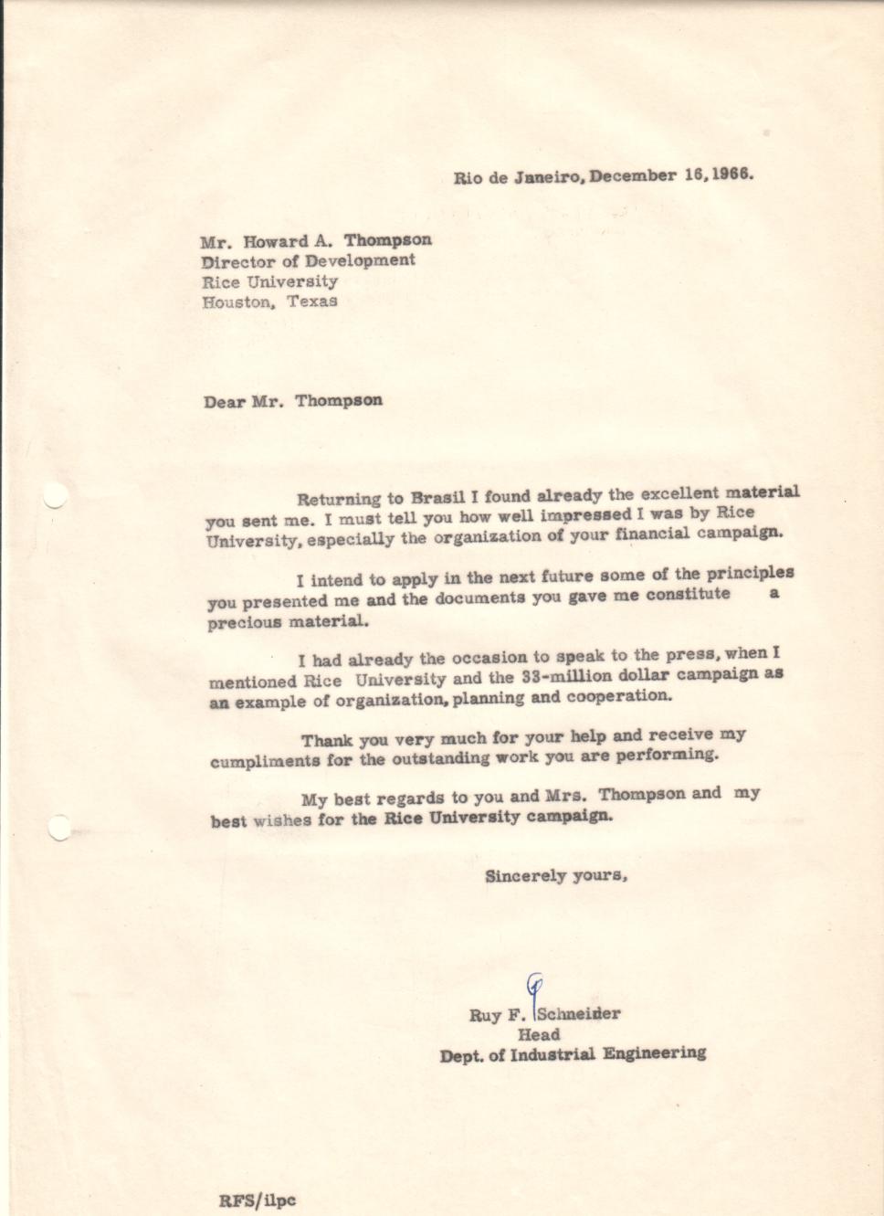 Correspondência do prof. Ruy Schneider (IND) para Howard Thompson (Rice University).