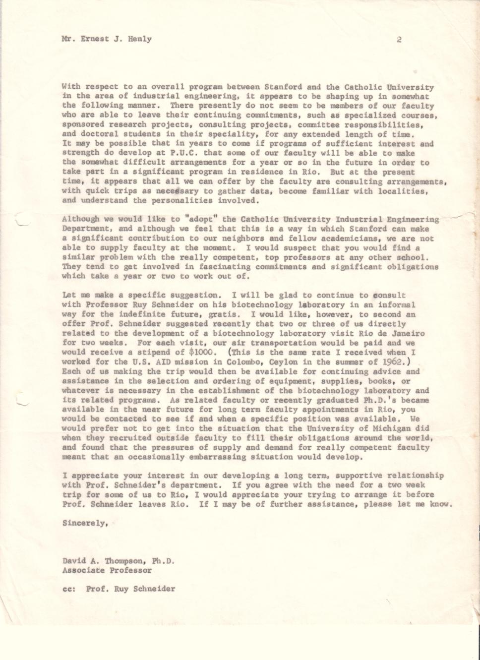 Correspondência de David A. Thompson (Stanford University) para Ernest J. Henly sobre uma colaboração entre a PUC-Rio e a Stanford University, com cópia para o prof. Ruy Schneider (IND).