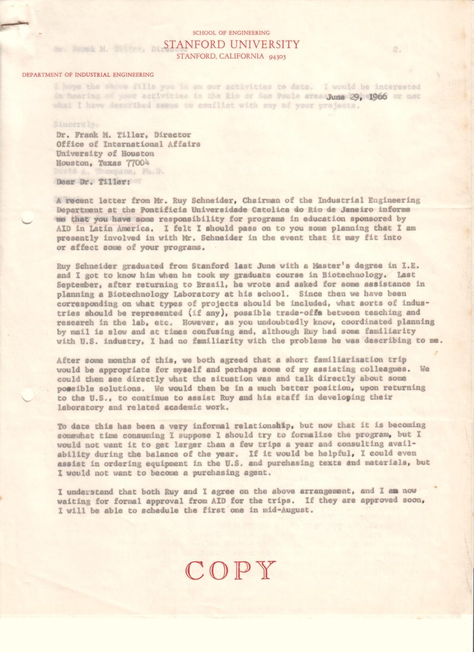 Cópia de correspondência com timbre da Stanford University, do prof. David Thompson (Stanford University) para Frank Tiller, com cópia para o prof. Ruy Schneider.