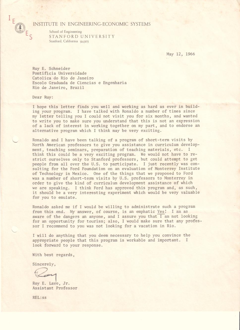 Correspondência com timbre da Stanford University do prof. Roy Lave (Institute in Engineering-Economic Systems) para o prof. Ruy Schneider (IND).
