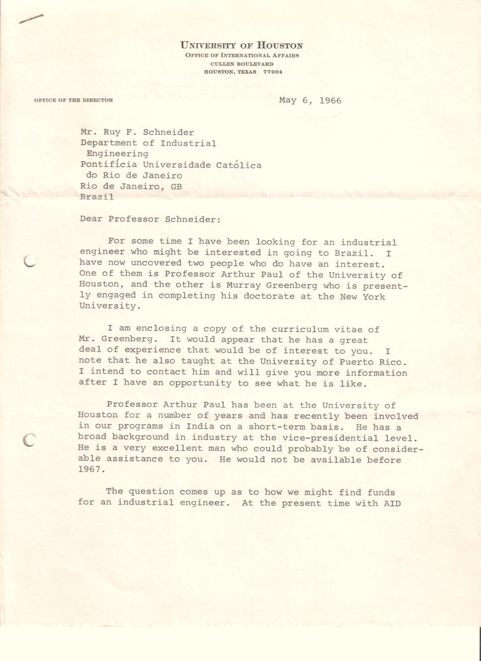 Correspondência de F. M. Tiller (University of Houston) para o prof. Ruy Schneider (IND)