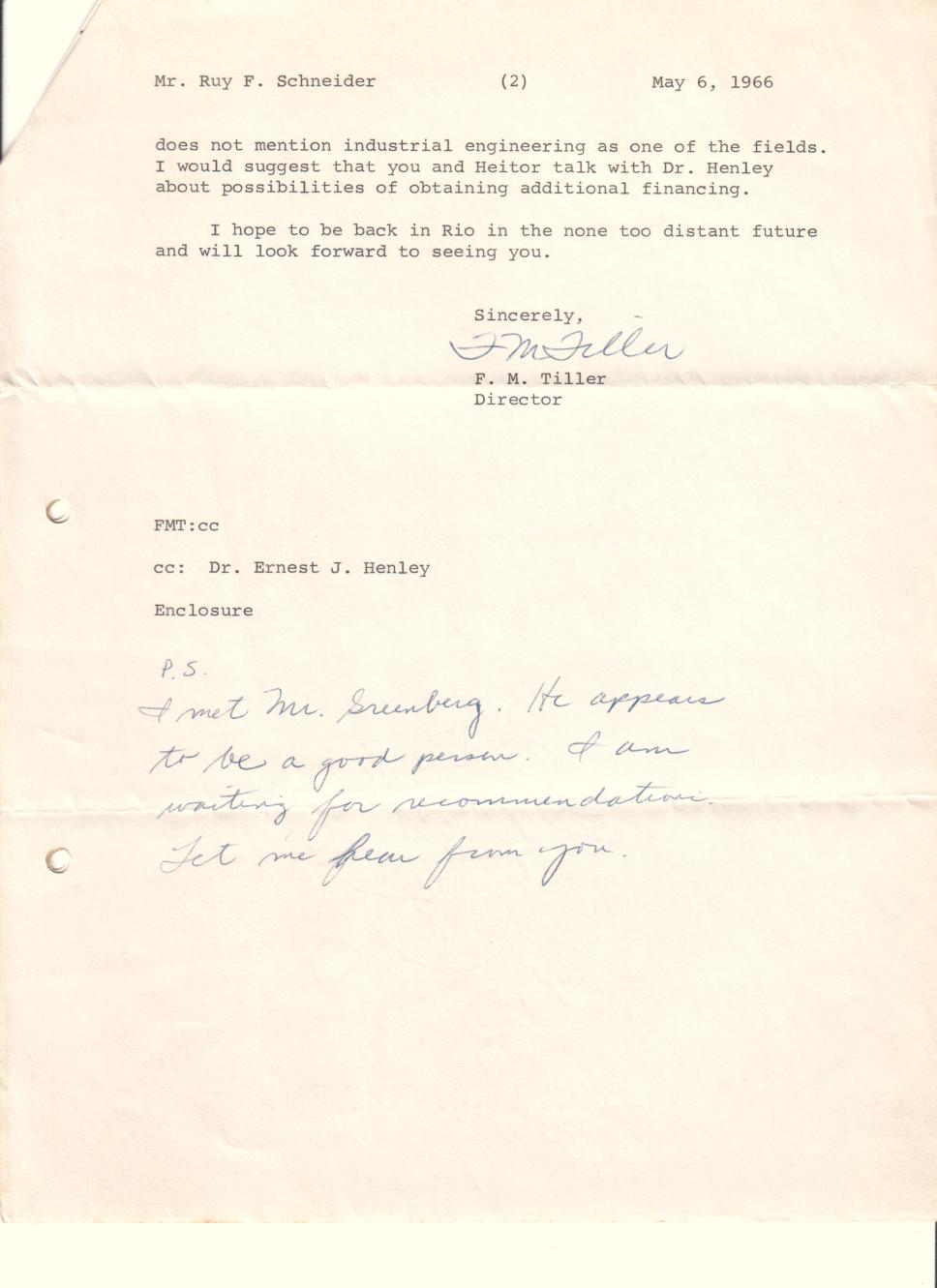 Correspondência de F. M. Tiller (University of Houston) para o prof. Ruy Schneider (IND)