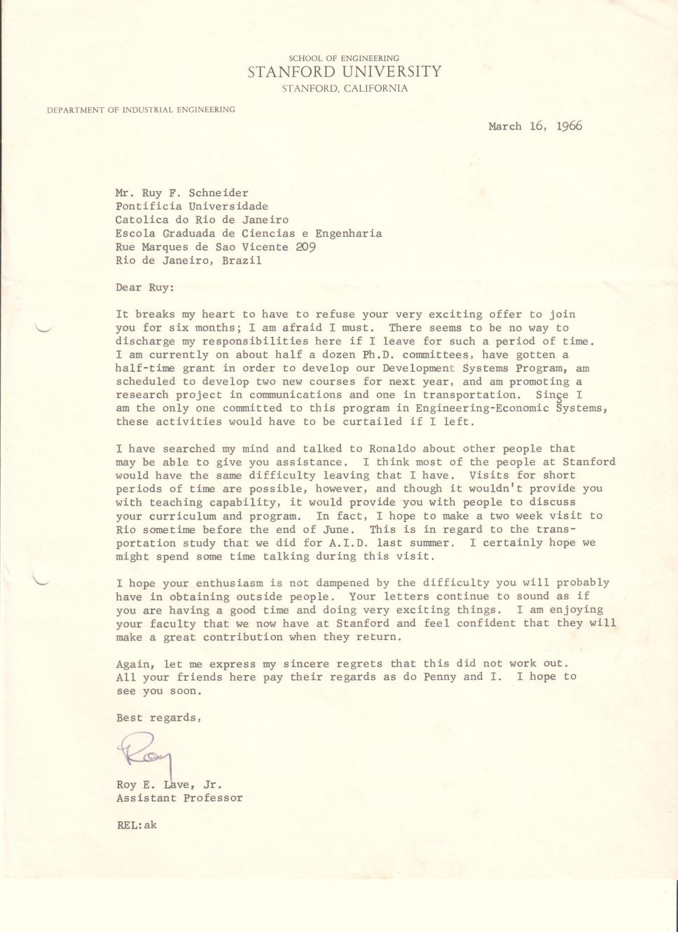 Correspondência com timbre da Stanford University do prof. Roy Lave para o prof. Ruy Schneider (IND).