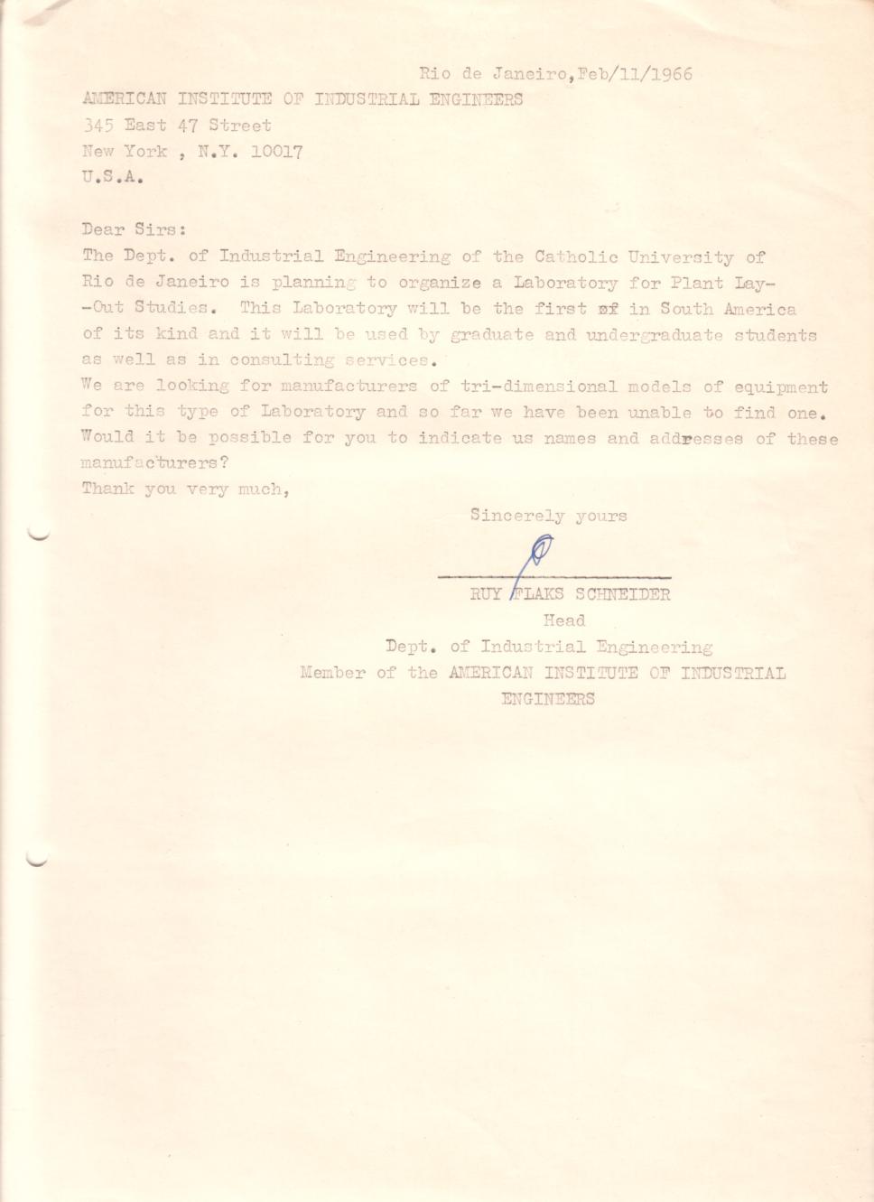 Correspondência do prof. Ruy Schneider (IND) para American Institute of Industrial Engineers