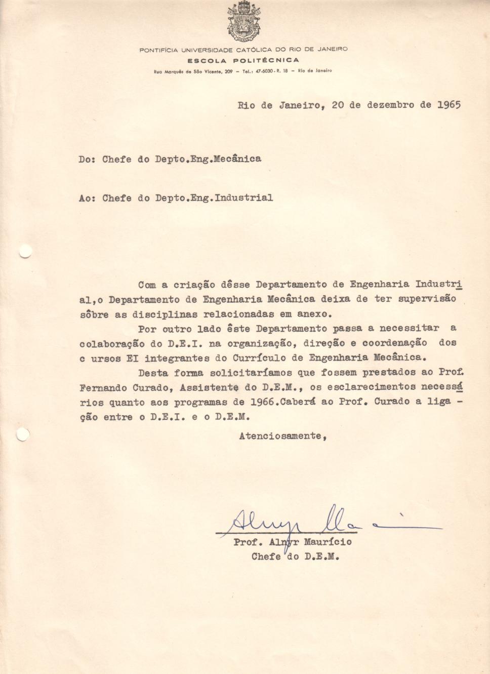 Correspondência do prof. Alnyr Maurício (MEC) para o chefe do Departamento de Engenharia Industrial sobre as disciplinas que passariam à supervisão do IND devido à criação do mesmo.