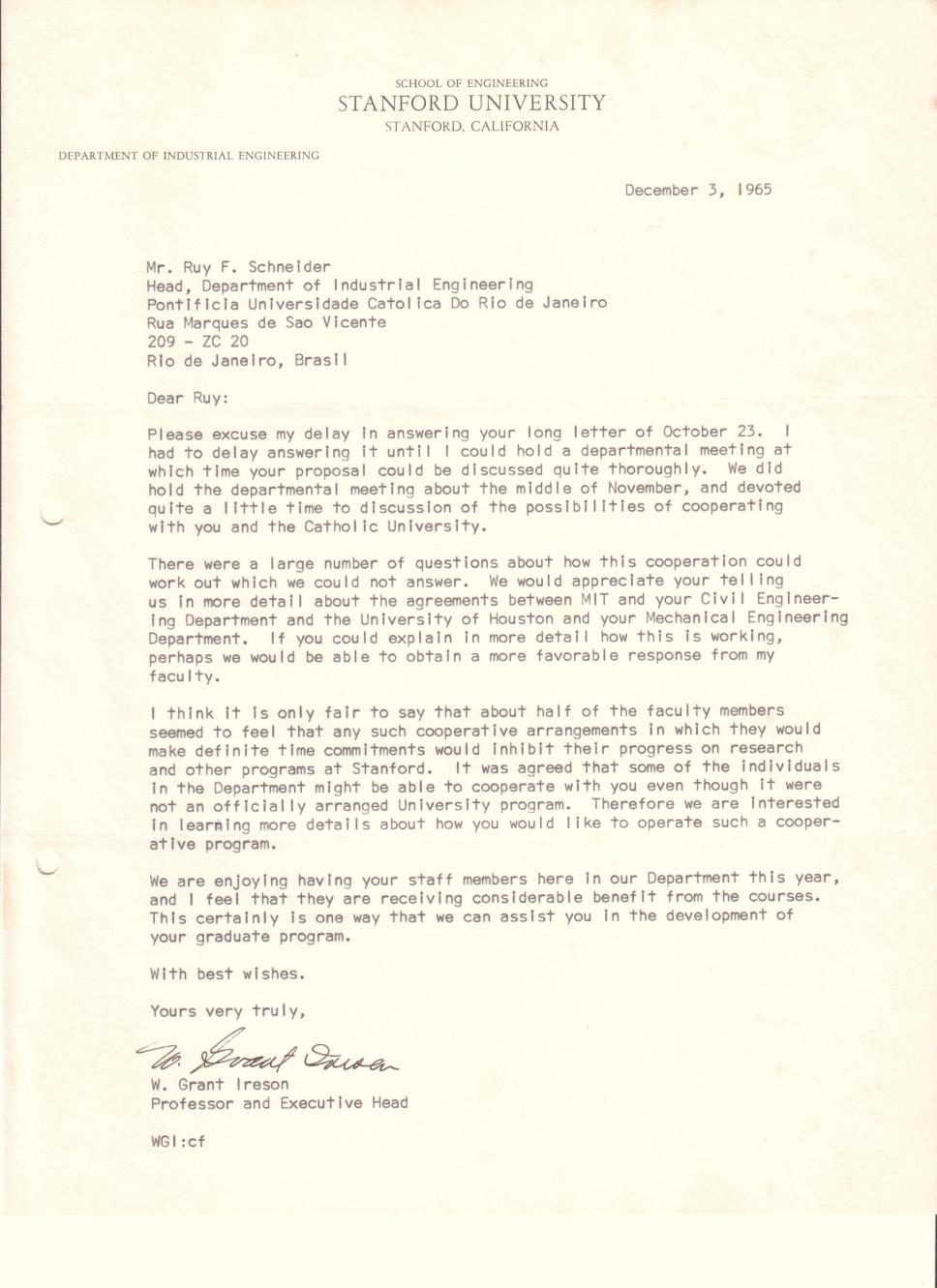Correspondência com timbre da Stanford University do prof. W. Grant Ireson para o prof. Ruy Schneider.