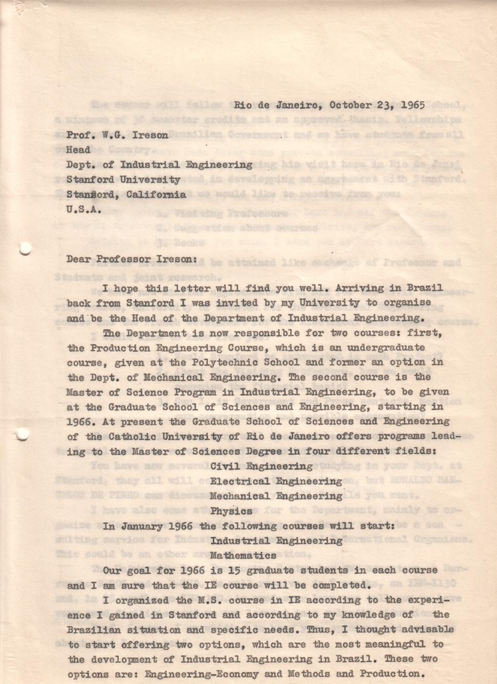 Correspondência do prof. Ruy Schneider (IND) para o prof. W. G. Ireson (Stanford University).