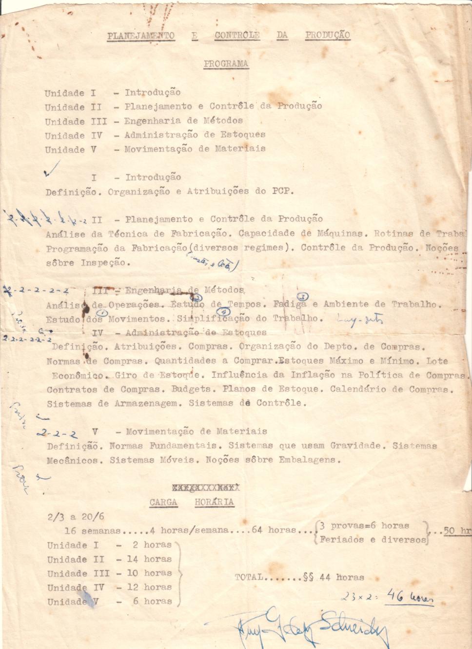 Programa do curso de Planejamento e Controle da Produção. Assinatura do prof. Ruy Schneider.