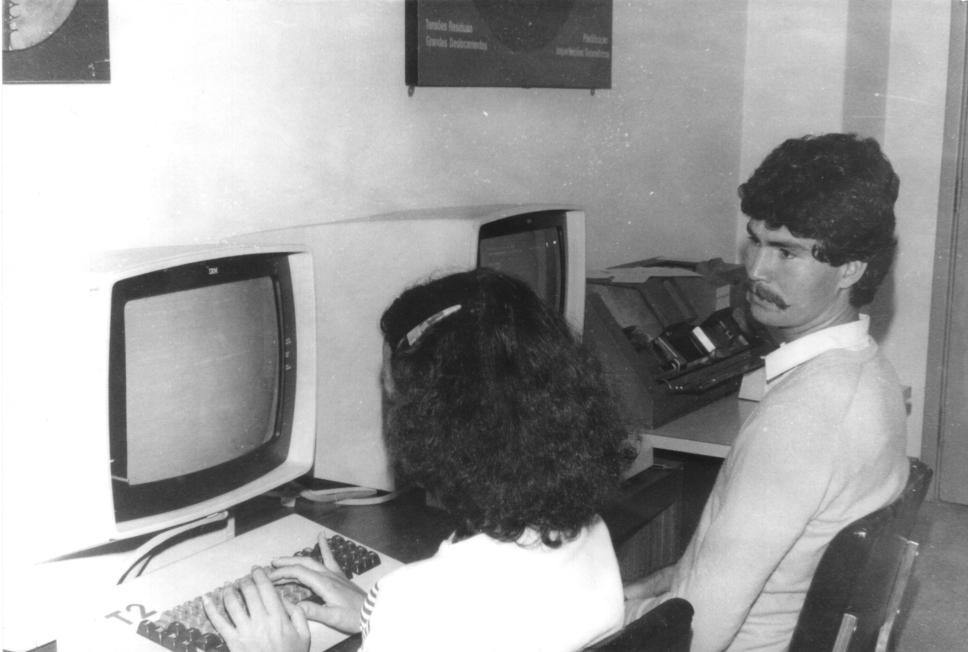 Pessoas utilizam terminais do computador IBM em sala do Departamento de Engenharia Civil.