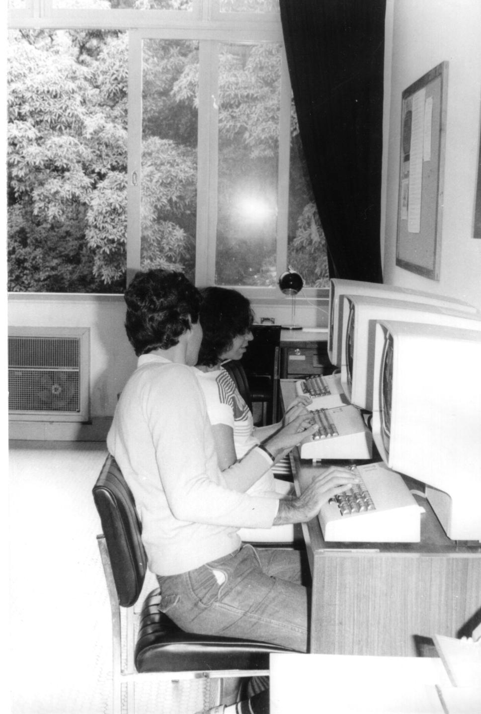 Pessoas utilizam terminais do computador IBM em sala do Departamento de Engenharia Civil.