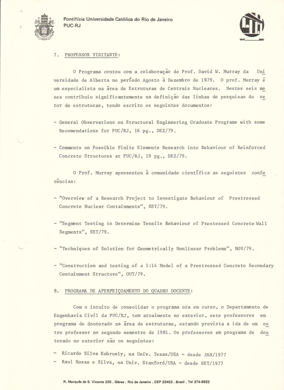 Relatório técnico do programa de mestrado em Engenharia Civil com ênfase Nuclear. Professor visitante e Programa de Aperfeiçoamento do Quadro Docente.