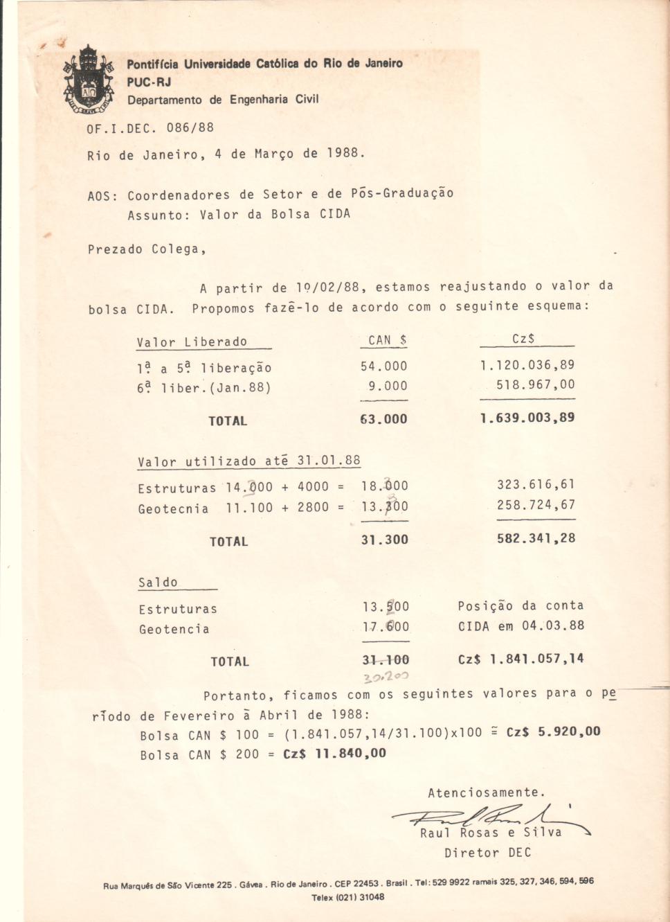 Correpondência do diretor para os coordenadores do Departamento de Engenharia Civil, informando reajuste dos valores das bolsas CIDA.