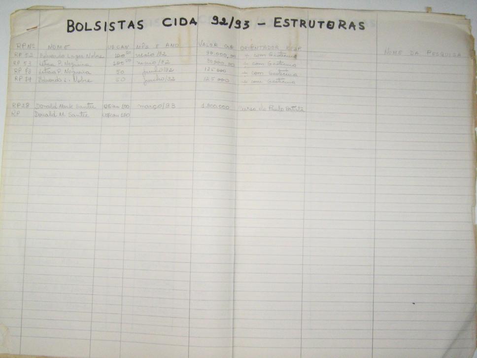 Planilha manual de controle dos bolsistas CIDA referente aos anos de 1992 e 1993.