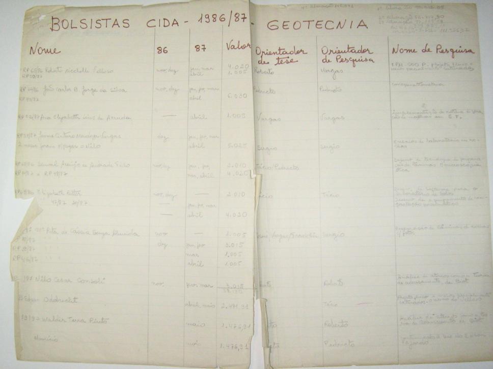 Planilha manual de controle dos bolsistas CIDA referente aos anos de 1986 e 1987.