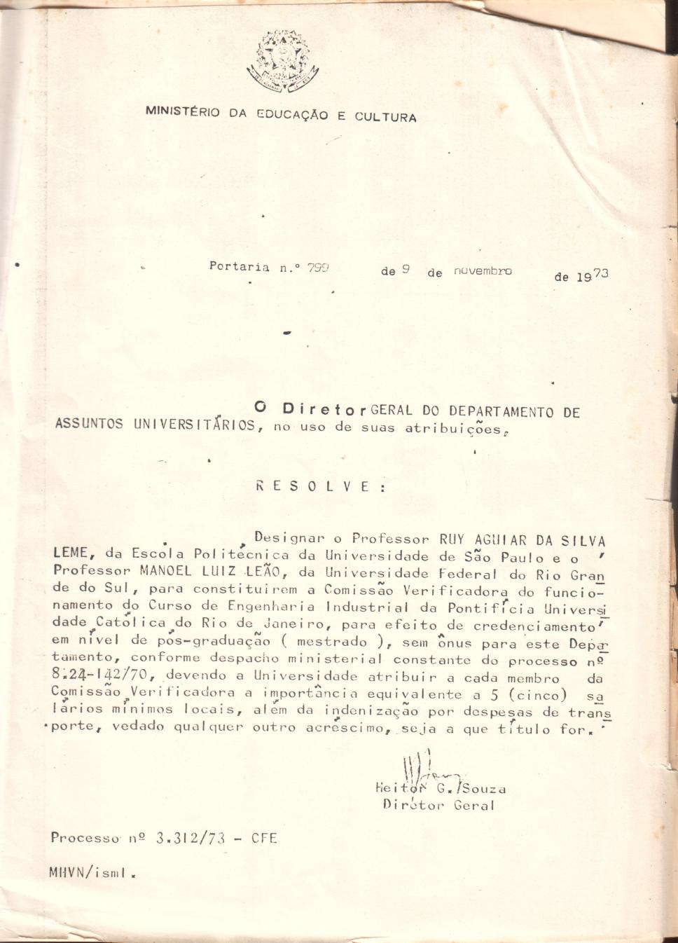 Designação, pelo MEC, dos nomes que constituiriam a Comissão Verificadora do funcionamento do curso de Engenharia Industrial da PUC-Rio.