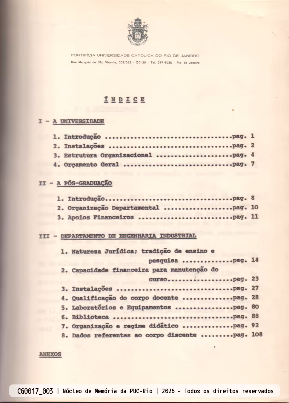 Índice da documentação relativa ao curso de mestrado do Departamento de Engenharia Industrial da PUC-Rio.