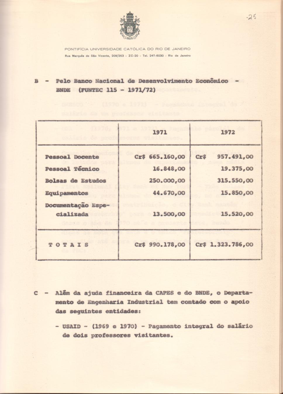 Página 25. Capacidade financeira para manutenção do curso. Contém tabela na qual consta o apoio financeiro concedido pelo BNDE, em cruzeiro, e inicia lista com outras instituições que concedem ajuda financeira ao Departamento de Engenharia Industrial.