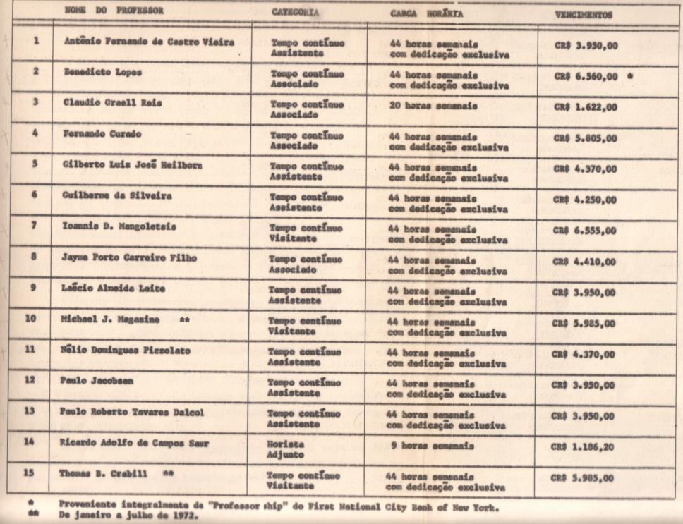 Lista dos professores, contendo categoria, carga horária e salários em cruzeiros.