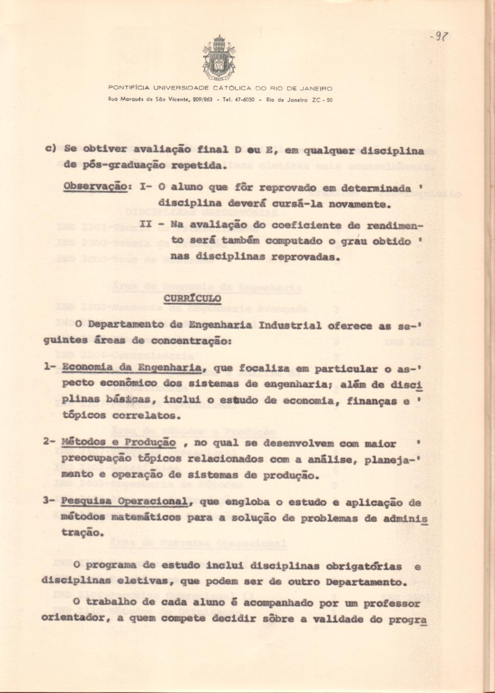 Página 97. Áreas de concentração e disciplinas oferecidas pelo Departamento de Engenharia Industrial.