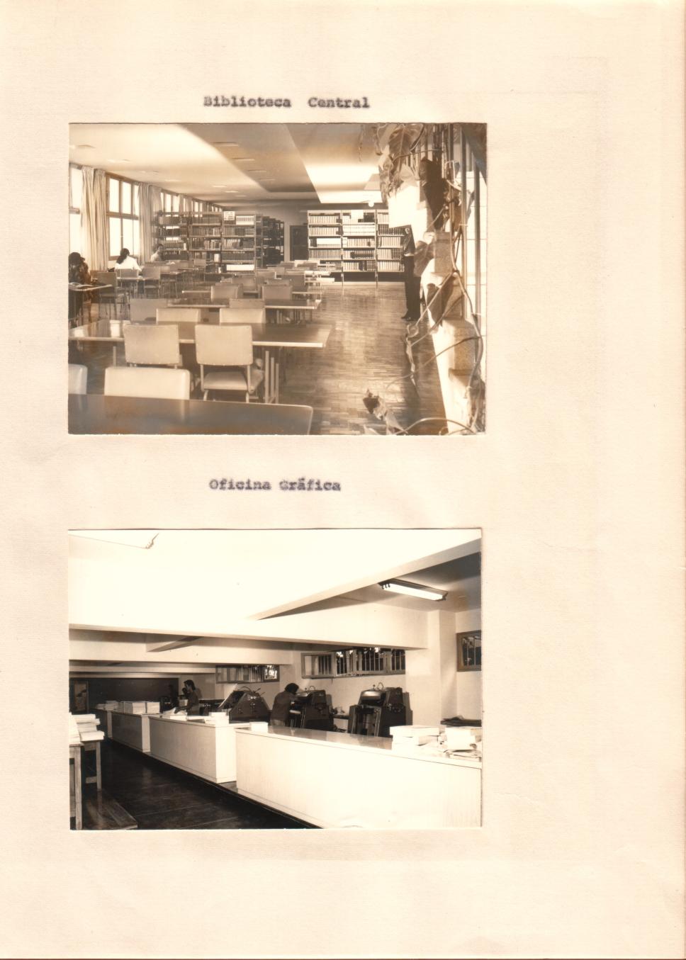 Fotografias do salão de leitura da Biblioteca Central e da Oficina Gráfica.