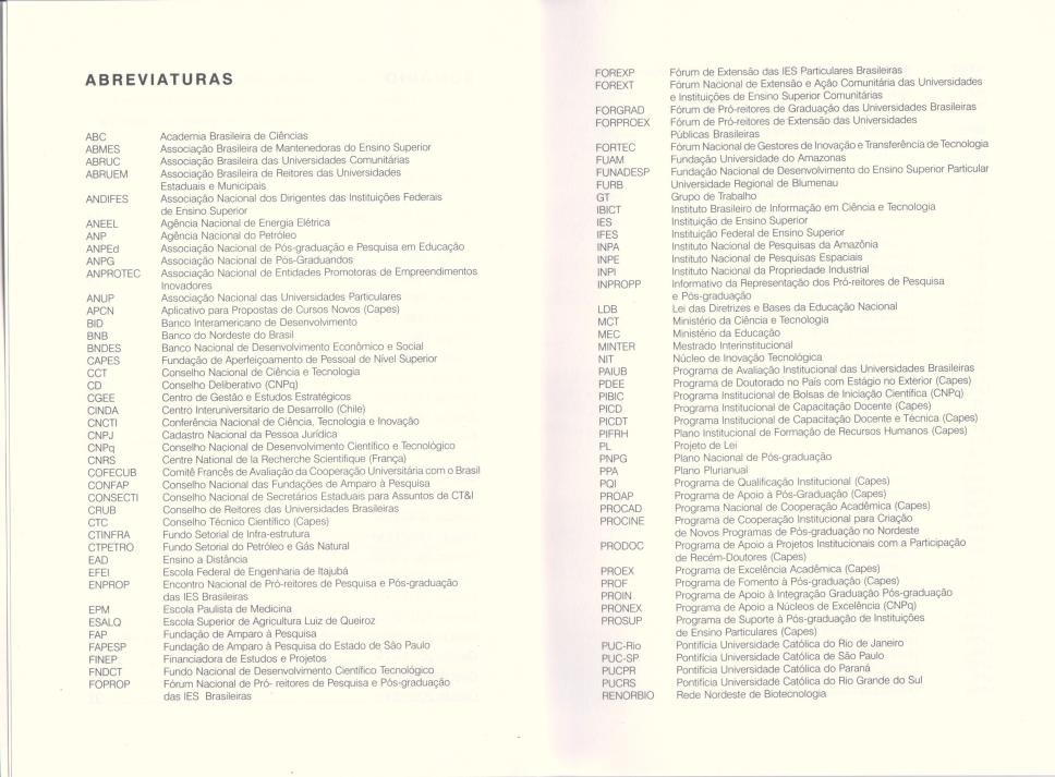 Lista de abreviaturas presente no livro Memória do Fórum de Pró-reitores de Pesquisa e Pós-graduação das Instituições de Ensino Superior Brasileiras.