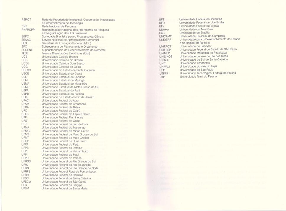 Lista de abreviaturas no livro Memória do Fórum de Pró-reitores de Pesquisa e Pós-graduação das Instituições de Ensino Superior Brasileiras.