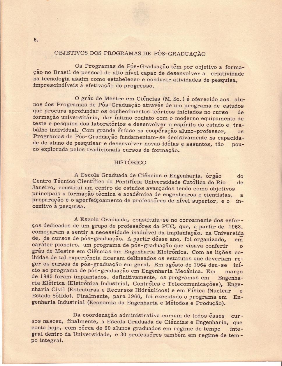 Seção referente aos 'Objetivos dos programas de pós-graduação' e ao 'Histórico' no Catálogo oficial da Escola Graduada de Ciências e Engenharia (EGCE), 1968 - 1969.