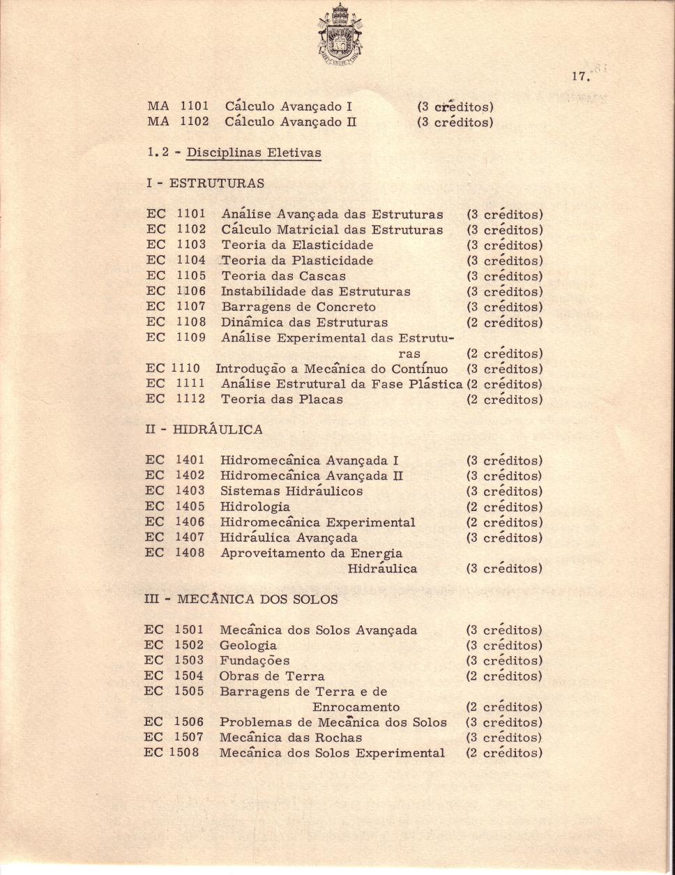 Seção referente à 'Engenharia civil', contendo os campos principais e as disciplinas eletivas, no Catálogo oficial da Escola Graduada de Ciências e Engenharia (EGCE), 1968 - 1969.