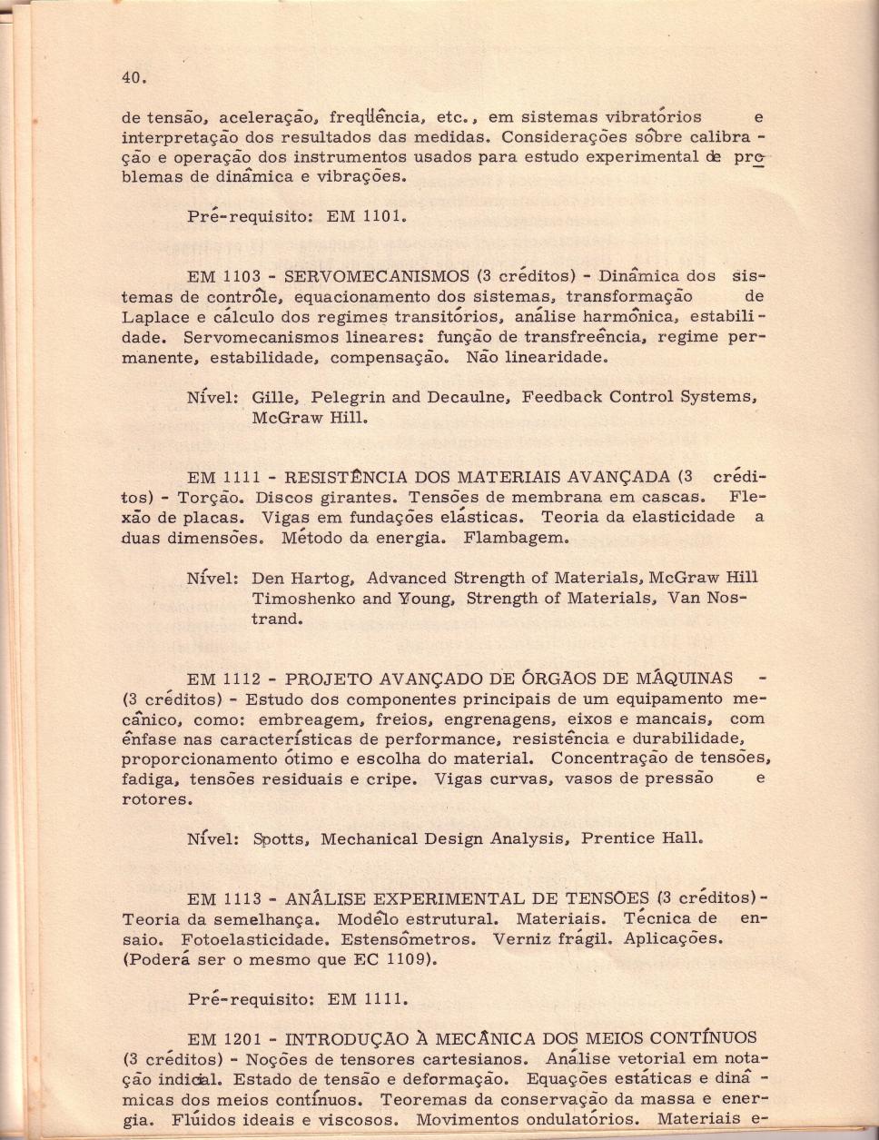 Seção referente à 'Engenharia Mecânica', que contém as ementas das disciplinas, no Catálogo oficial da Escola Graduada de Ciências e Engenharia (EGCE), 1968 - 1969.