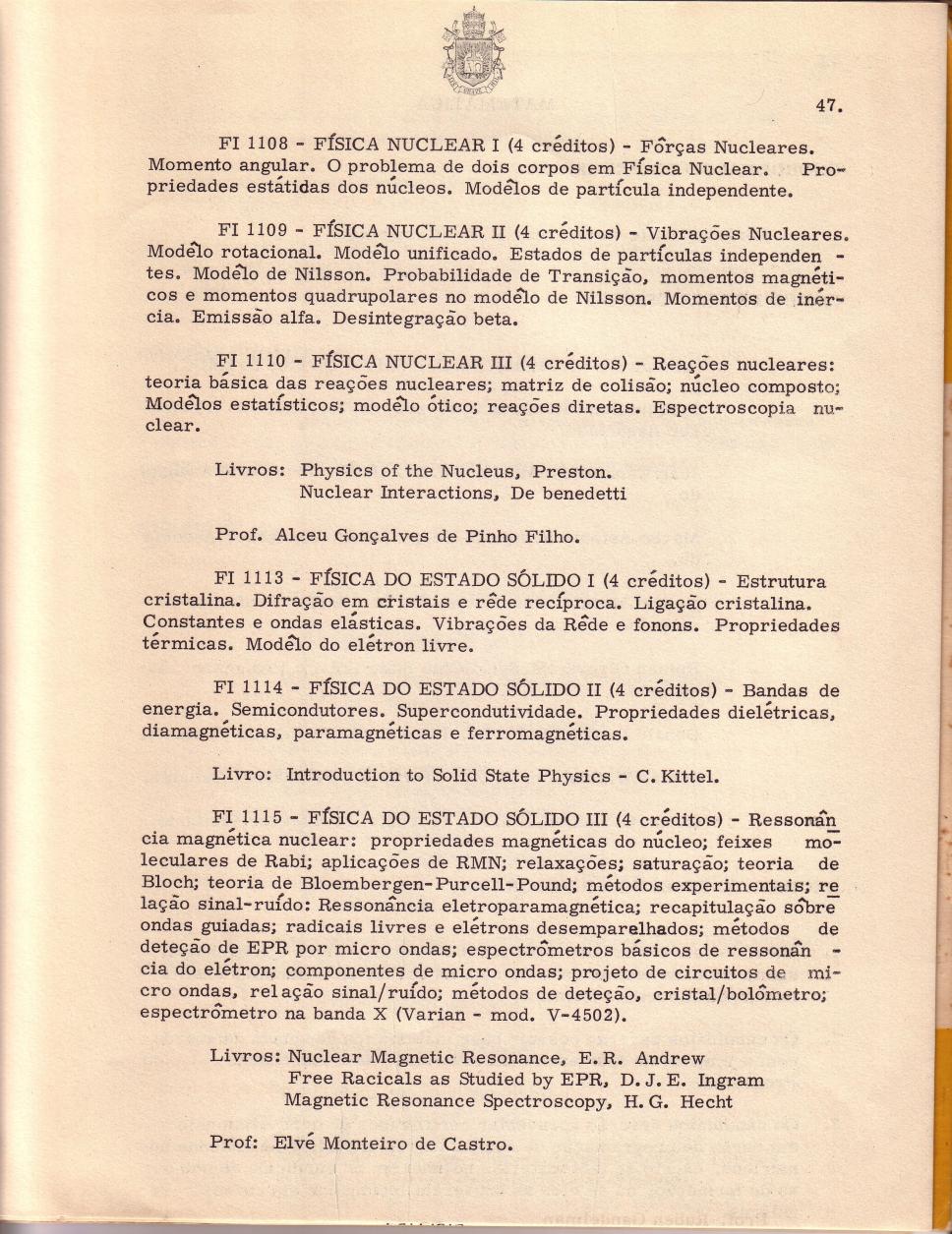 Seção referente à 'Física', que contém as ementas das disciplinas, no Catálogo oficial da Escola Graduada de Ciências e Engenharia (EGCE), 1968 - 1969.