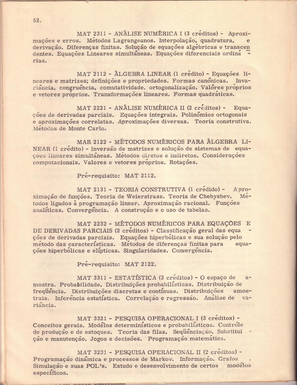 Seção referente à 'Matemática', que contém as ementas das disciplinas, no Catálogo oficial da Escola Graduada de Ciências e Engenharia (EGCE), 1968 - 1969.