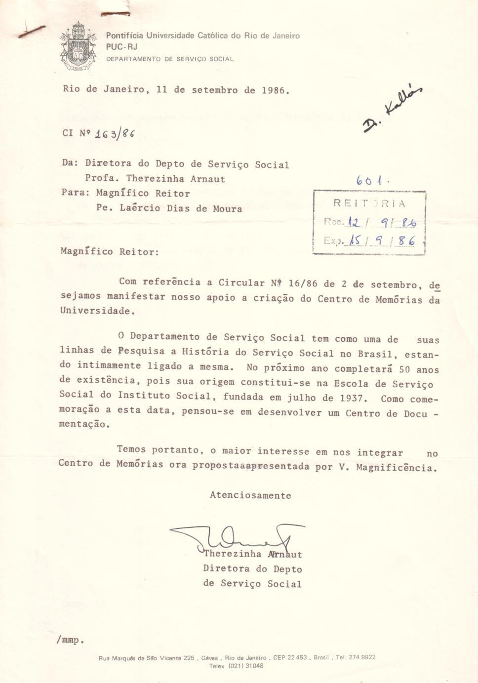 Folha 01 da correspondência interna de autoria da diretora do Departamento de Serviço Social, profa. Therezinha Arnaut, para a Reitoria, em resposta à circular enviada pelo Reitor sobre o Centro de Memórias. O documento faz referência à linha de pesquisa em História do Serviço Social no Brasil, que iria completar, em 1987, 50 anos.