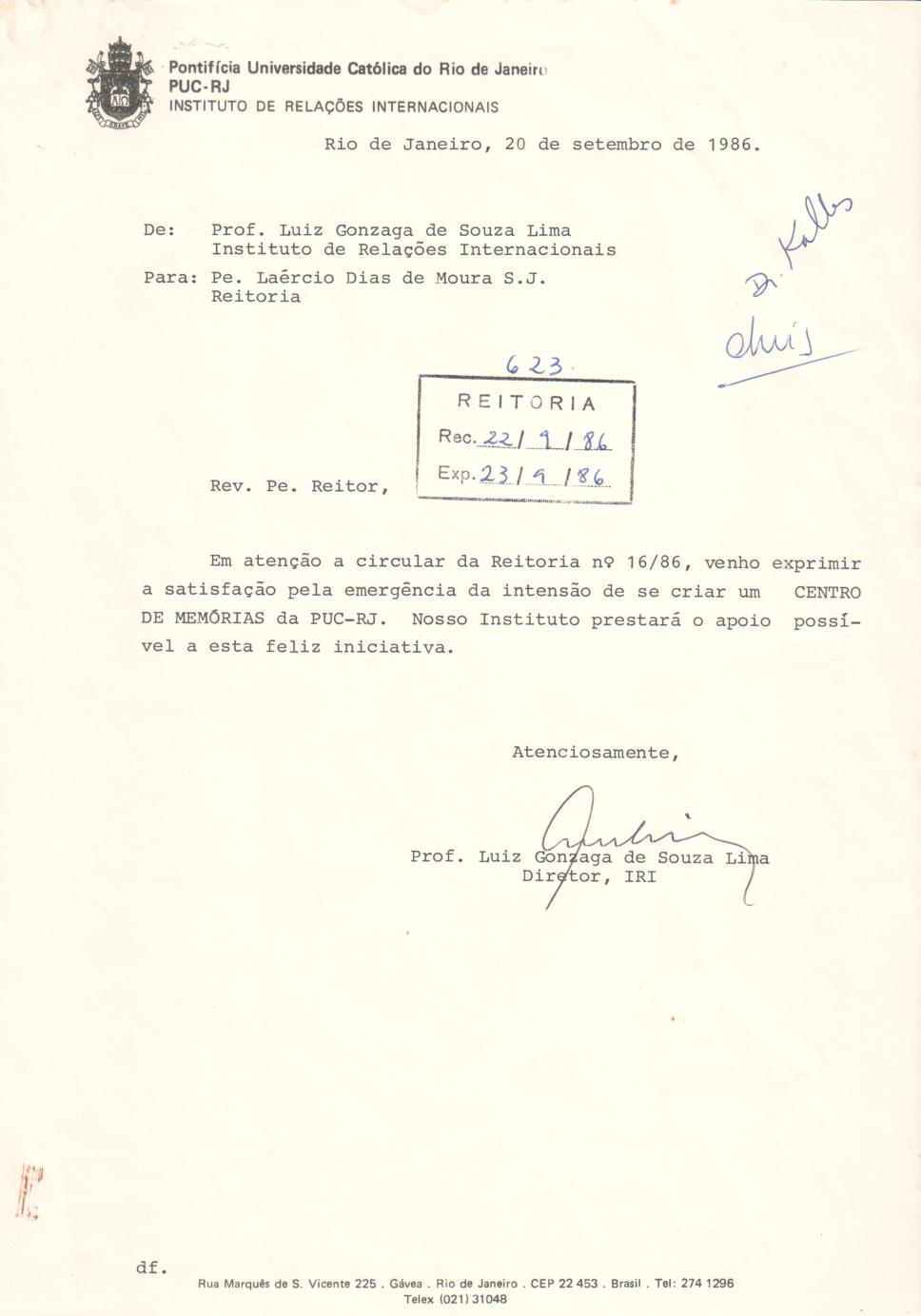 Correspondência interna de autoria do diretor do Instituto de Relações Internacionais, prof. Luiz Gonzaga de Souza Lima, para a Reitoria, em resposta à circular enviada pelo Reitor sobre a criação Centro de Memórias.