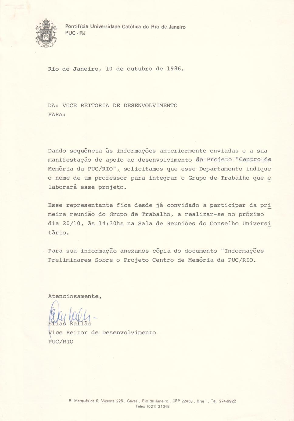Correspondência interna de autoria do Vice-Reitor Acadêmico, prof. Elias Kallás, solicitando aos diretores de departamento que nomeiem um professor para integrar o Grupo de Trabalho encarregado de elaborar o projeto para o Centro de Memória da PUC/RJ. Haveria uma reunião em 20/10/1986.