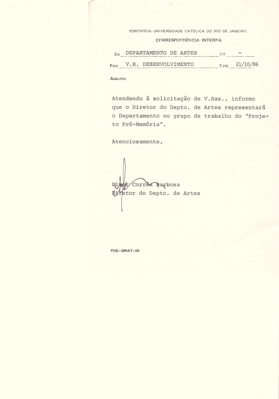 Correspondência interna enviada pelo diretor do Departamento de Artes, prof. Elmer Corrêa Barbosa, para a Vice-Reitoria de Desenvolvimento, referente à representação do dito departamento no trabalho de preparação do projeto do Centro de Memórias.