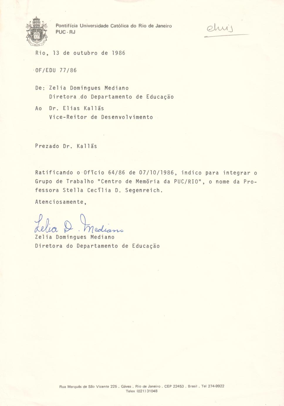 Correspondência interna enviada pela diretora do Departamento de Educação, profa. Zelia Domingues Mediano, para a Vice-Reitoria de Desenvolvimento, referente à representação do dito departamento no trabalho de preparação do projeto do Centro de Memórias.