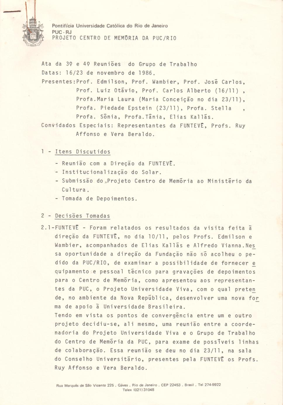 Ata das terceira e quarta reuniões do grupo de trabalho, realizadas em 16 e 23/11/1986. Convidados especiais: representantes da Funtevê, prof. Ruy Affonso e profa. Vera Beraldo. Itens discutidos: reunião com a direção da Funtevê; institucionalização do Solar; submissão do Projeto Centro de Memória ao Ministério da Cultura; tomada de depoimentos.