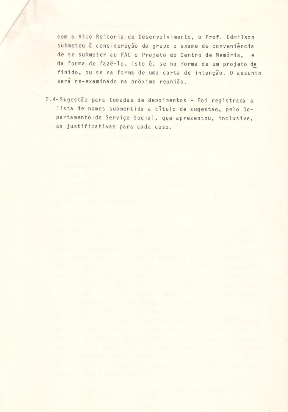 Ata das terceira e quarta reuniões do grupo de trabalho, realizadas em 16 e 23/11/1986. Convidados especiais: representantes da Funtevê, prof. Ruy Affonso e profa. Vera Beraldo. Itens discutidos: reunião com a direção da Funtevê; institucionalização do Solar; submissão do Projeto Centro de Memória ao Ministério da Cultura; tomada de depoimentos.